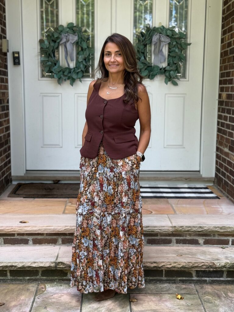 Bring On Fall! A great transition look to effortlessly go from summer to fall. This beautiful skirt pairs back to this chocolate vest, which is